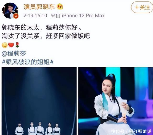 2020年,程莉莎参加《乘风破浪的姐姐2》被淘汰。 郭晓东面对失落的妻子并没有暖心安慰。 反而发文催促对方回家做饭。 网友见此,再次化身为“正义使者”。 认为郭晓东束缚妻子的自由,不支持对方的事业。 可事实上,却是程莉莎乐在其中。