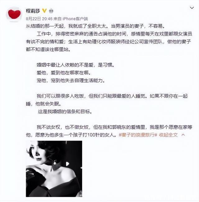 婚后,程莉莎彻底放弃事业。 成为郭晓东背后的女人。 在家相夫教子、打理家务。 从前的演员事业早已被忘之脑后。 只有郭晓东是她的全部。